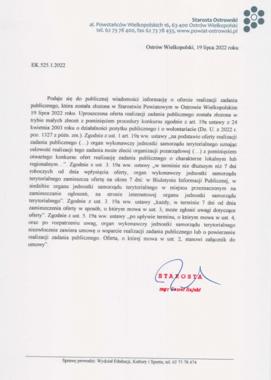 Podaje się do publicznej wiadomości informację o ofercie realizacji zdania publicznego, która została zlożona w Starostwie Powiatowym w dn. 19 ipca 2022 r. ( dot. wsparcia tradycji kulturalno-społecznej Powiatu Ostrowskiego).
