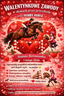 W walentynkowym klimacie, ale trochę wcześniej — Stajnia Borowianka zaprasza na dzień pełen skoków, uśmiechów i… koników na patyku. Sportowa rywalizacja przeplata się tu z zabawą i nagrodami, a atmosfera zapowiada się serdecznie i kolorowo. Warto wpaść albo zapisać się na start — na miejscu będą emocje dla widzów i zawodników.